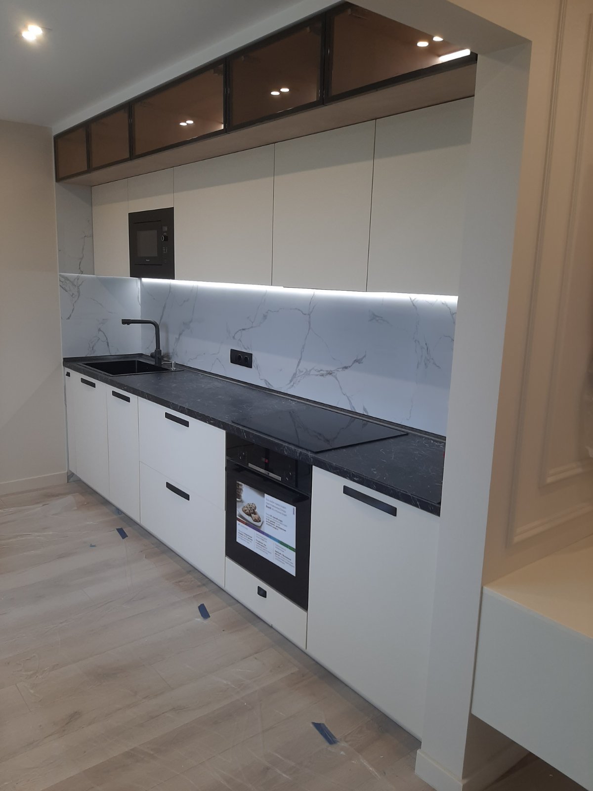 Встраиваемая кухня в современном стиле с подсветкой над столешницей.
