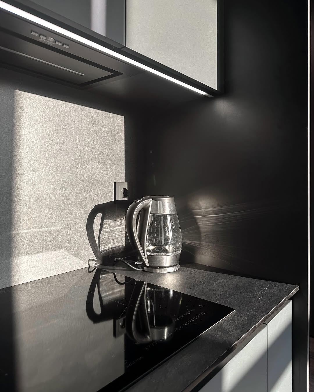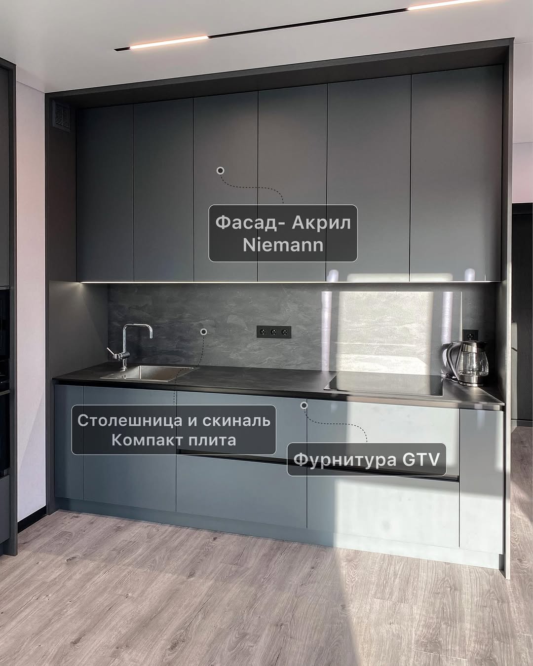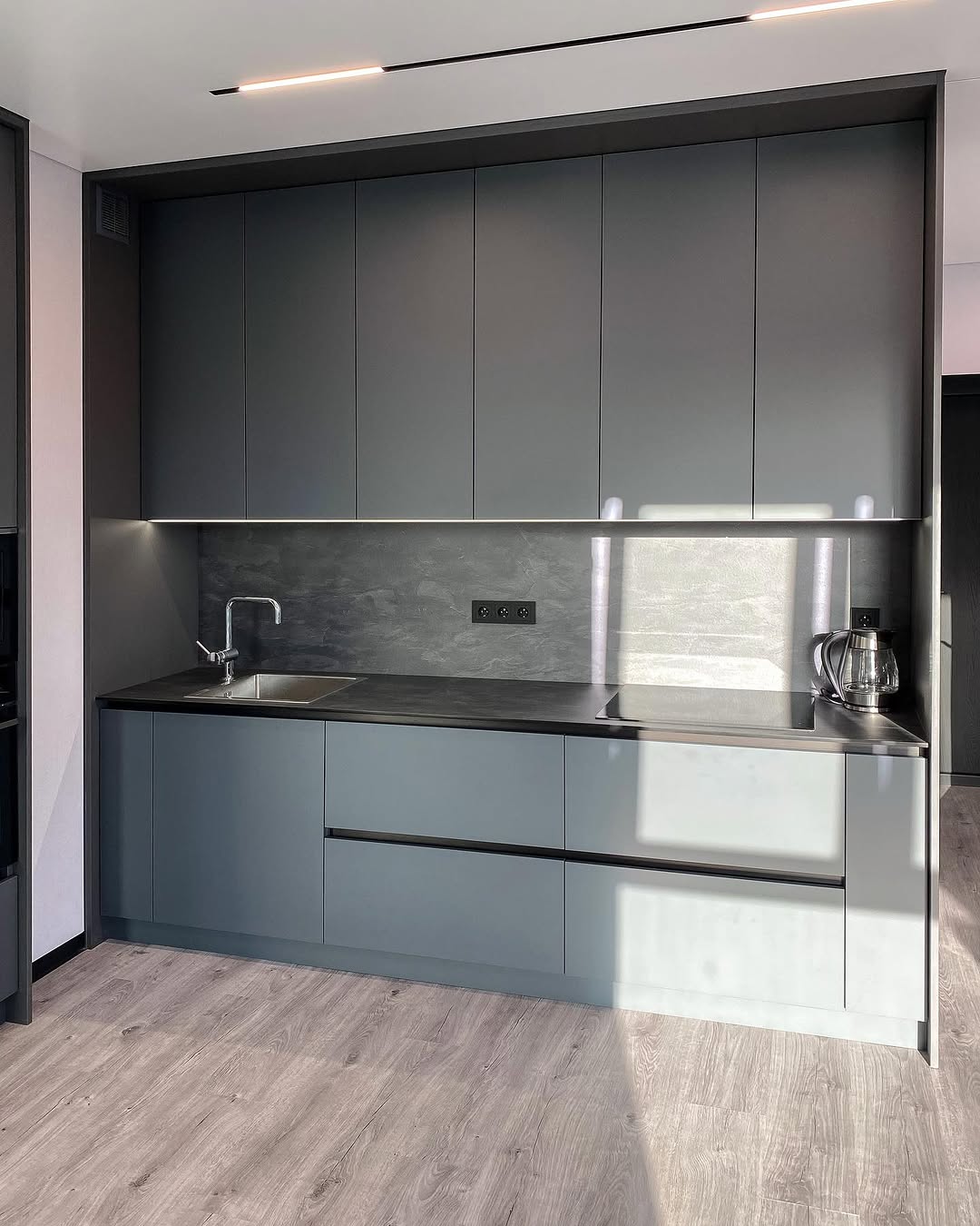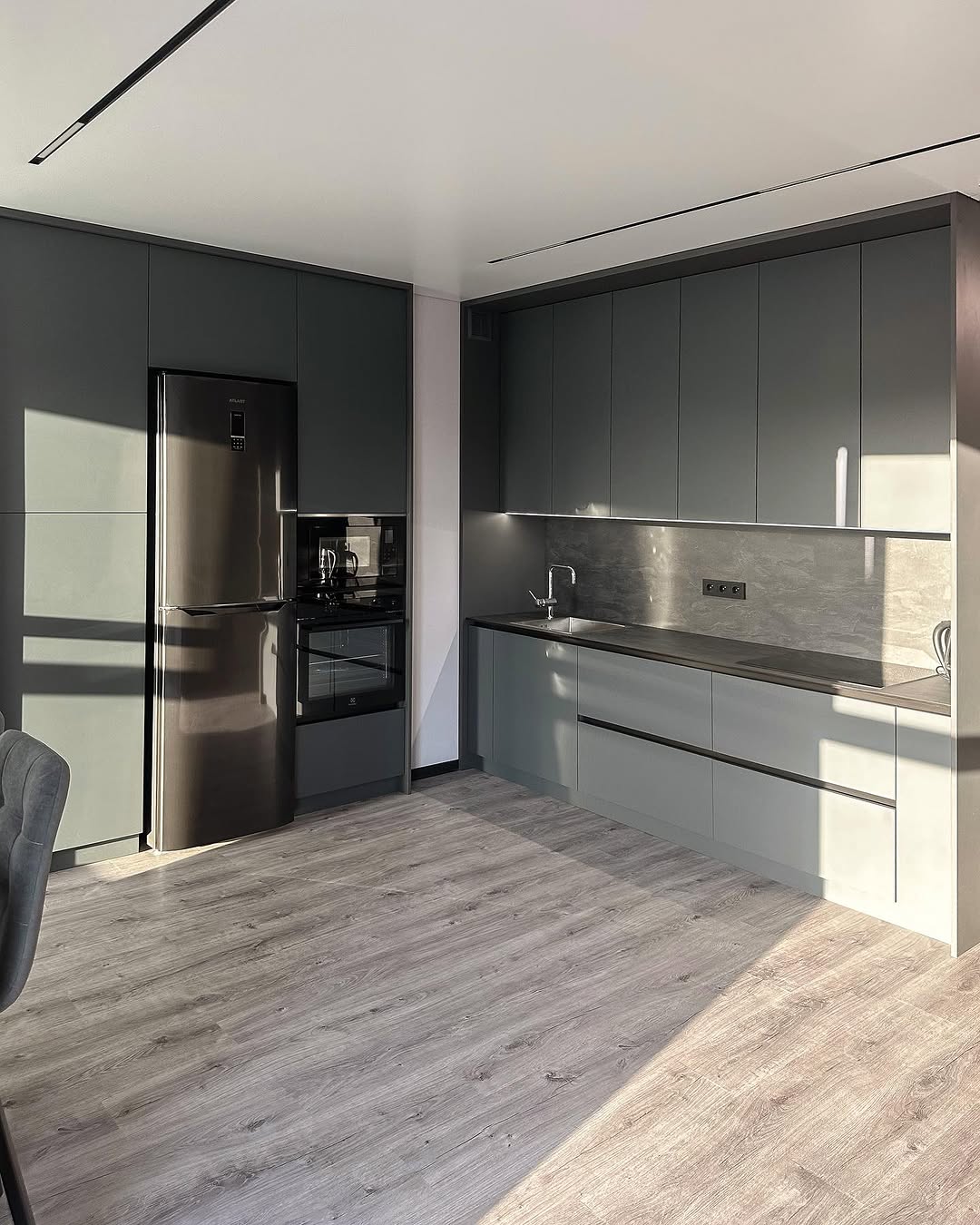 Современная кухня в графитовом цвете — идеальное решение для тех, кто ценит минимализм, строгую геометрию и функциональность. Встроенность и однотонность создают эффект «сплошной стены».
