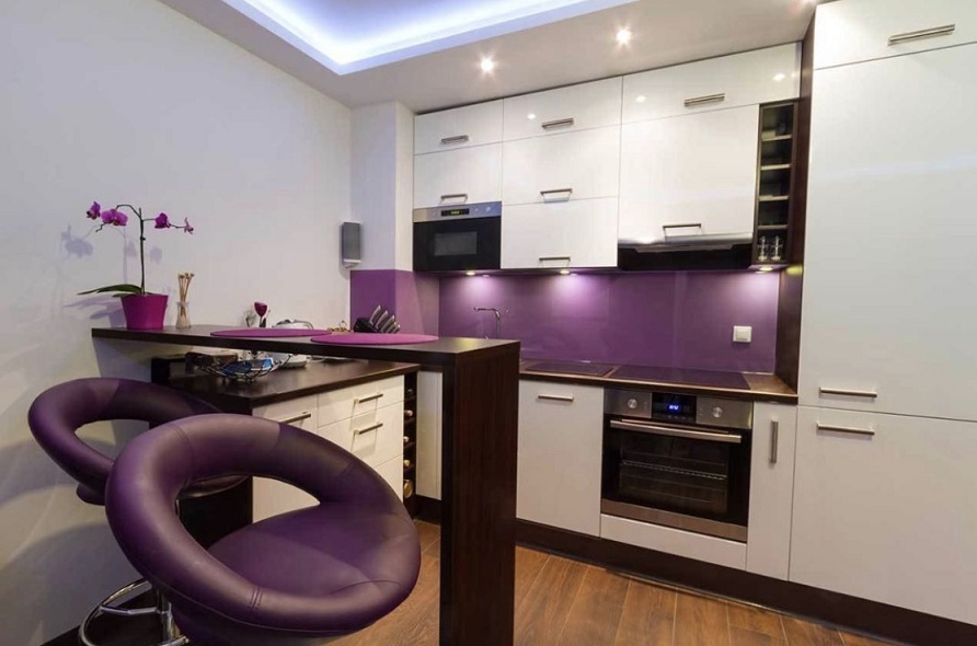 Высокие верхние шкафы, барная стойка, встроенный холодильник.