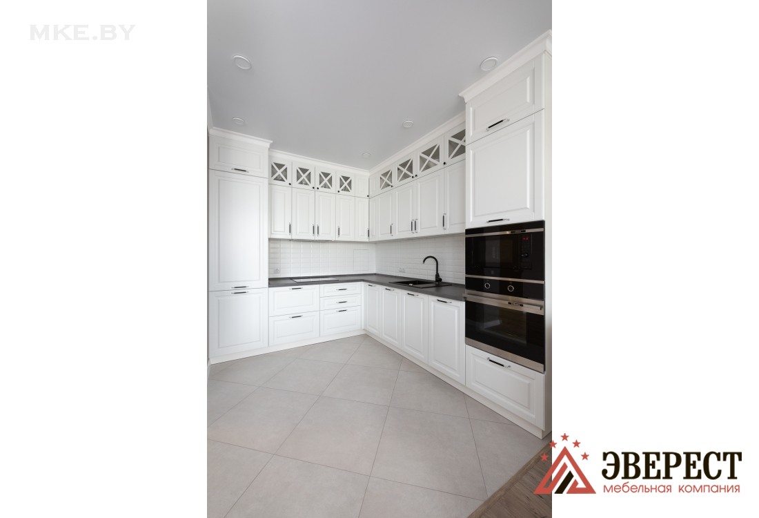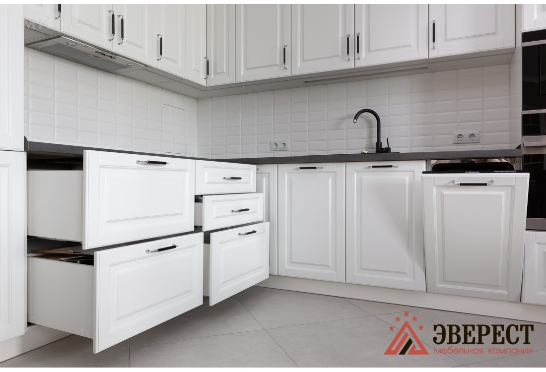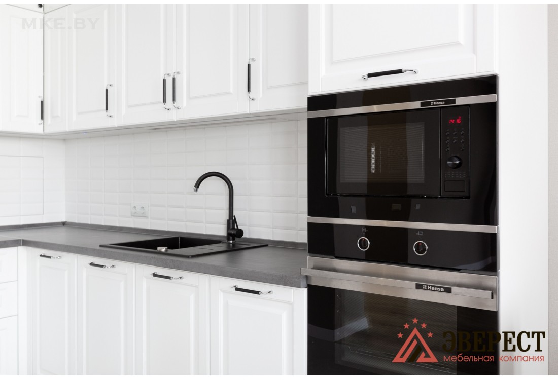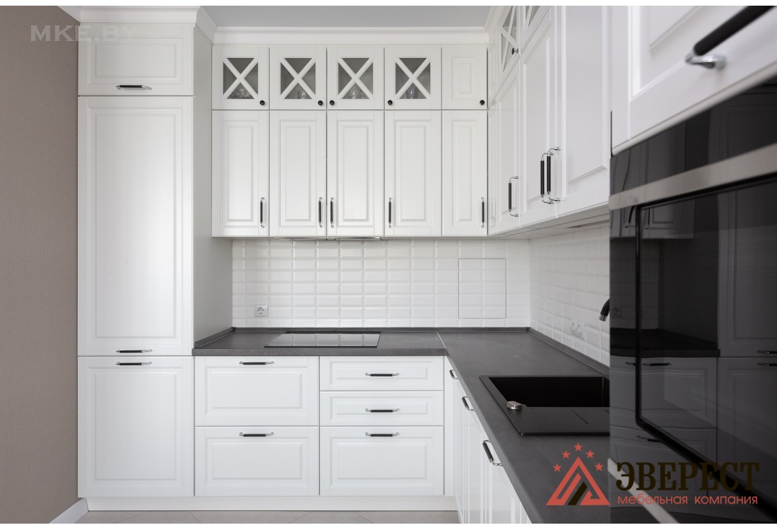 Модель кухни выполнена в угловой форме и изготовлена из МДФ. Кухни из МДФ легко моются и отчищаются от грязи, обладают низкой восприимчивостью к влаге, высоким температурам, и механическим воздействиям. Фрезерованные фасады с удобными ручками исполнены в белом цвете, верхние ящики имеют решетчатый вид. Кухня оснащена теплой подсветкой и вставками для кухонной техники.