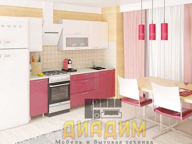 Данная кухня выполнена в ярких оттенках. Верхние шкафы представлены в белом цвете, нижние - в розовом. Миниатюрные размеры этой модели позволяют разместиться в небольшом помещении. Кухня оснащена удобной фурнитурой и вместительными ящиками для столовых приборов.