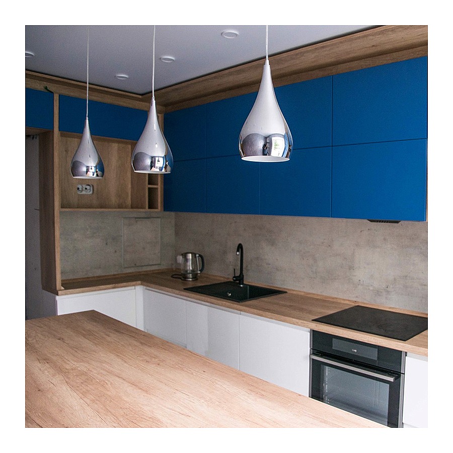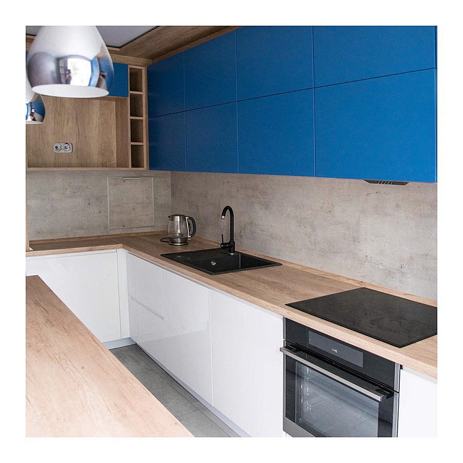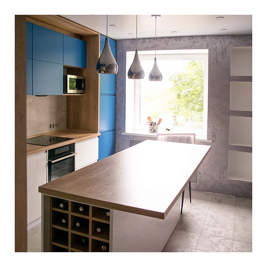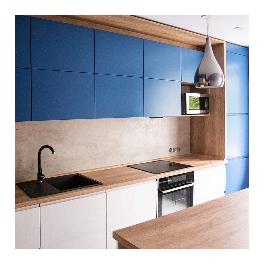 Особенностью этой кухни является интересное размещение верхних синих шкафов. Они обрамлены в древесную рамку, что достигается благодаря совпадению цвета ДСП и постформинга. Это придаёт кухне особый шарм и делает её уникальной.