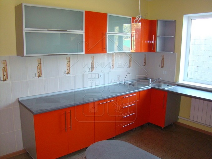 Кухня представлена в угловой форме в оранжевом цвете. Поверхность имеет легкие глянцевые переливы. Фурнитура гармонично сочетается с фасадами. В силу того, что она достаточно широкая, на нее можно повесить полотенце.
