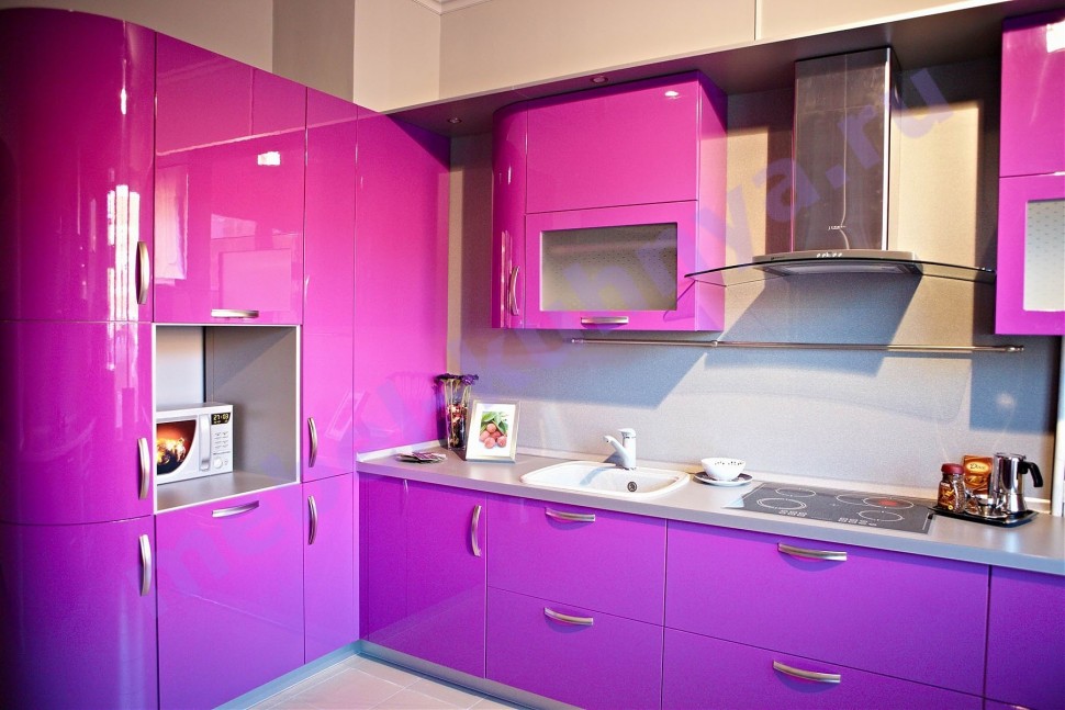 Кухонный гарнитур с глянцевыми сиреневыми фасадами