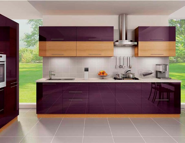 Коричневые вставки с темным фиолетовым фасадом. Удлиненные ручки.
