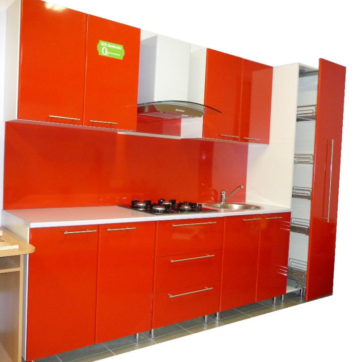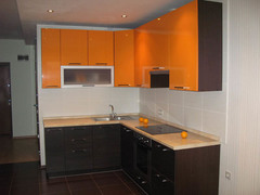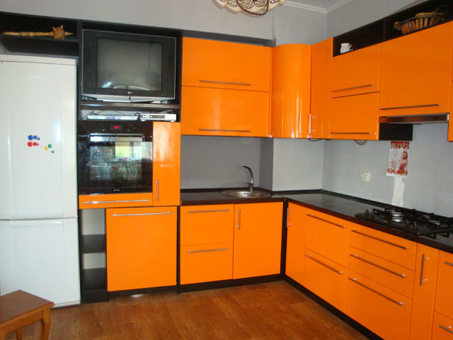 Глянцевое покрытие фасадов. Небольшая кухня из пластика оранжевая.