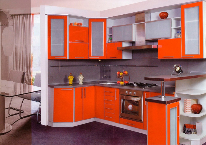 Угловая кухня с фасадами в оранжевом цвете