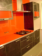 Кухня черно-оранжевая со стеклянным фартуком