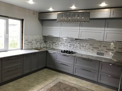 Современная угловая кухня в серых тонах. Верхние фасады без ручек.