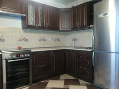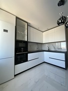 Стильная угловая кухня в полной комплектации. Фасады матовые с частичным остеклением сверху.
