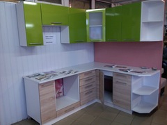 Фабричная угловая кухня. Большое количество функциональных полок и ящиков.
