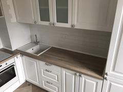 Кухня с матовыми светлыми фасадами. Глубина шкафов со столешницей: 60 мм.