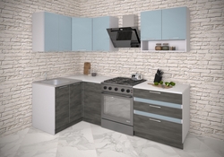 Готовый угловой кухонный гарнитур с фасадами из ЛДСП двух оттенков.