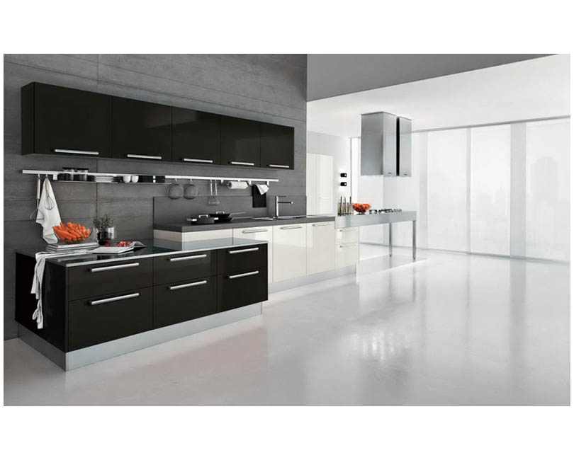 Глянцевые фасады с рисунком. Ручки прямоугольной формы.