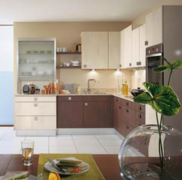 J-образная кухня. Сочетание на фасадах венге и бежевой эмали.