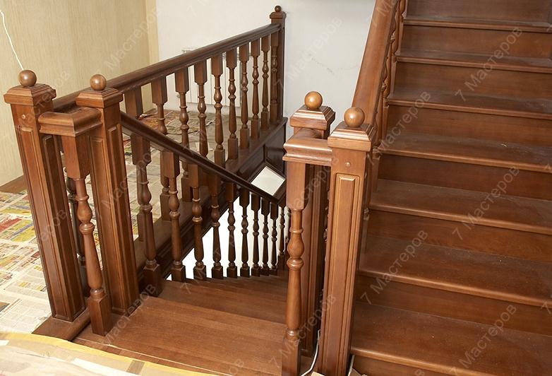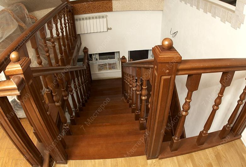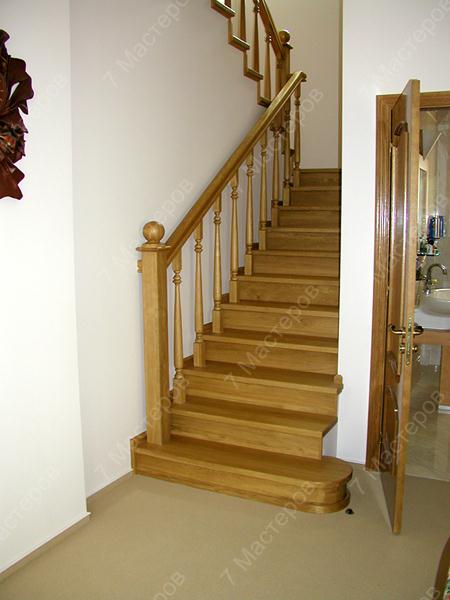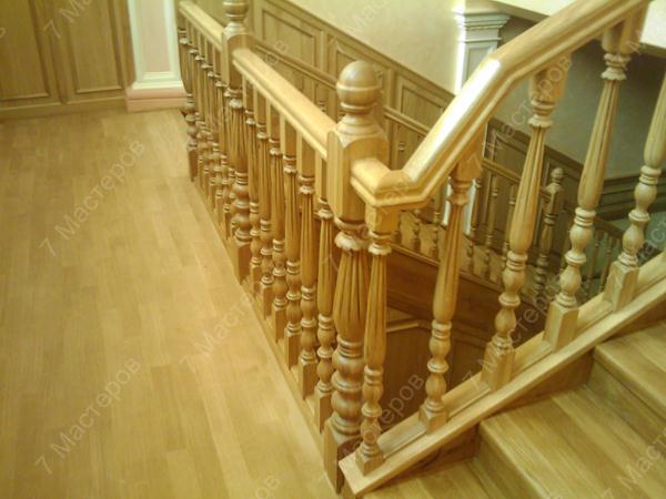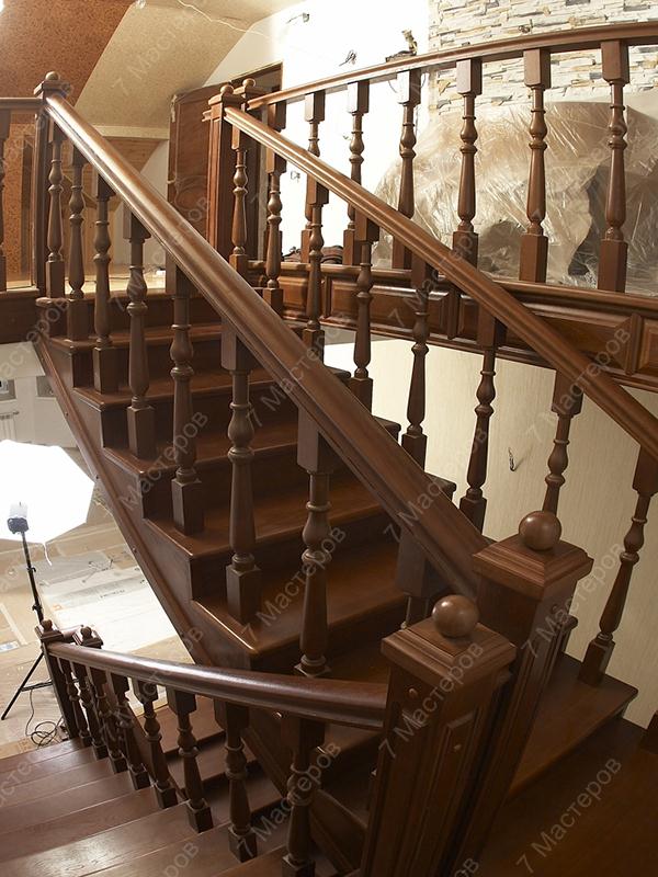 Прочная лестница выполнена из массива дерева с использованием объемных круглых набалдашников. Лестница оформлена в светлый дубовый цвет, который придает ей насыщенности. Креативные резные балясины, вместе с плавными линиями перил подчеркивают прочность конструкции.