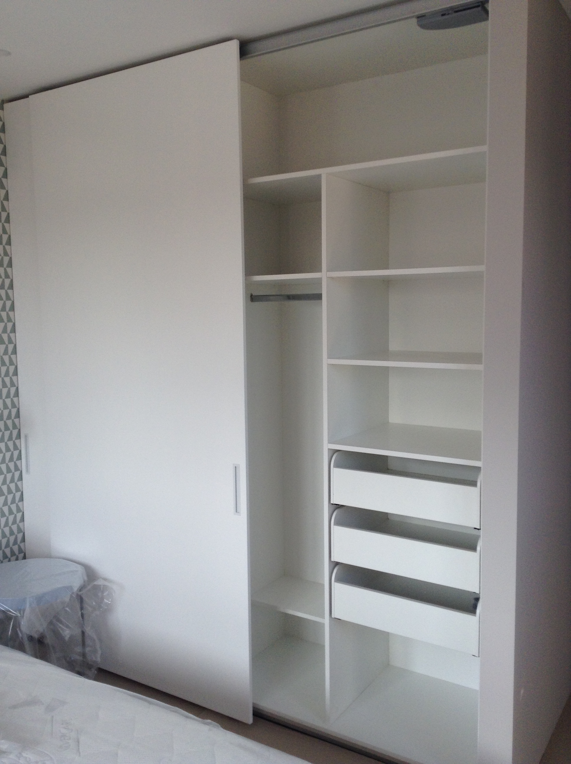 Встроенный в нишу гардеробный шкаф-купе на две широкие створки в приятном белом матовом исполнении с аккуратными врезными ручками. Универсальный белоснежный цвет подойдет к любым спальным интерьерам, в особенности для функционального минимализма.