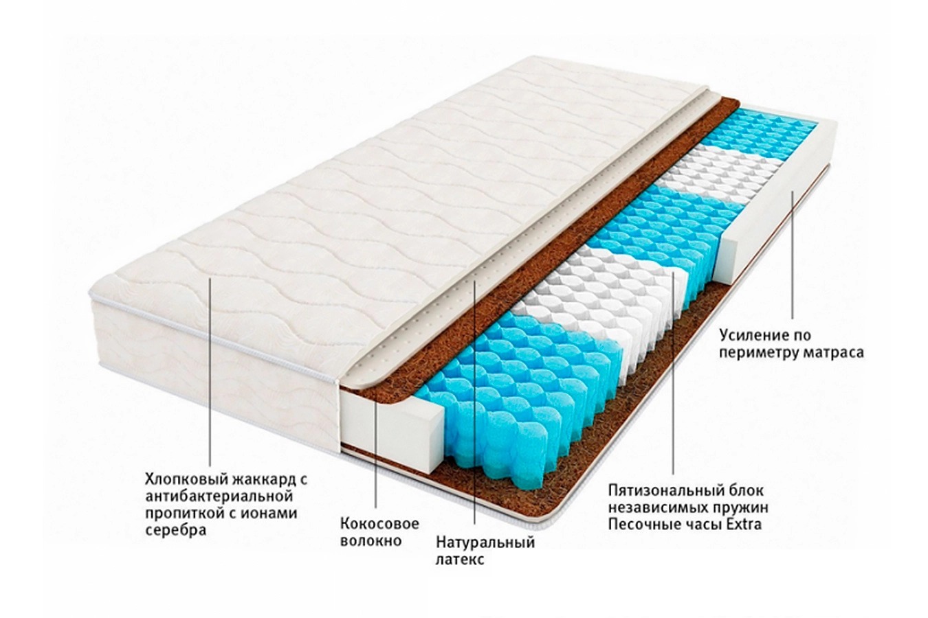 Особый ортопедический эффект обеспечивает блок независимых пружин «Песочные часы Extra», а также применение специальных материалов. Необходимый уровень жёсткости создает плита, сделанная на основе кокосовой койры. Для ощущения мягкости и упругости выше проложен слой латекса.