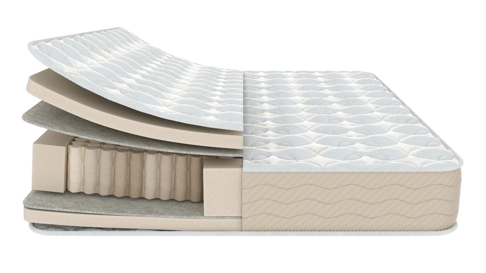 Пружинная система Adapt Spring высокой жесткости c увеличенным количеством витков адаптируется под любые движения тела, обеспечивая упругую поддержку без дополнительного жесткого слоя кокоса. Эластичная латексированная пена поддерживает правильное положение тела и повышает комфорт во время сна, а хлопковый войлок является дополнительным слоем защиты и усиливает эффект анатомической поддержки.