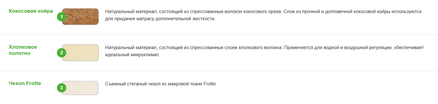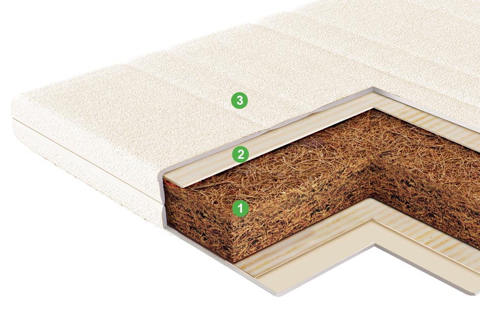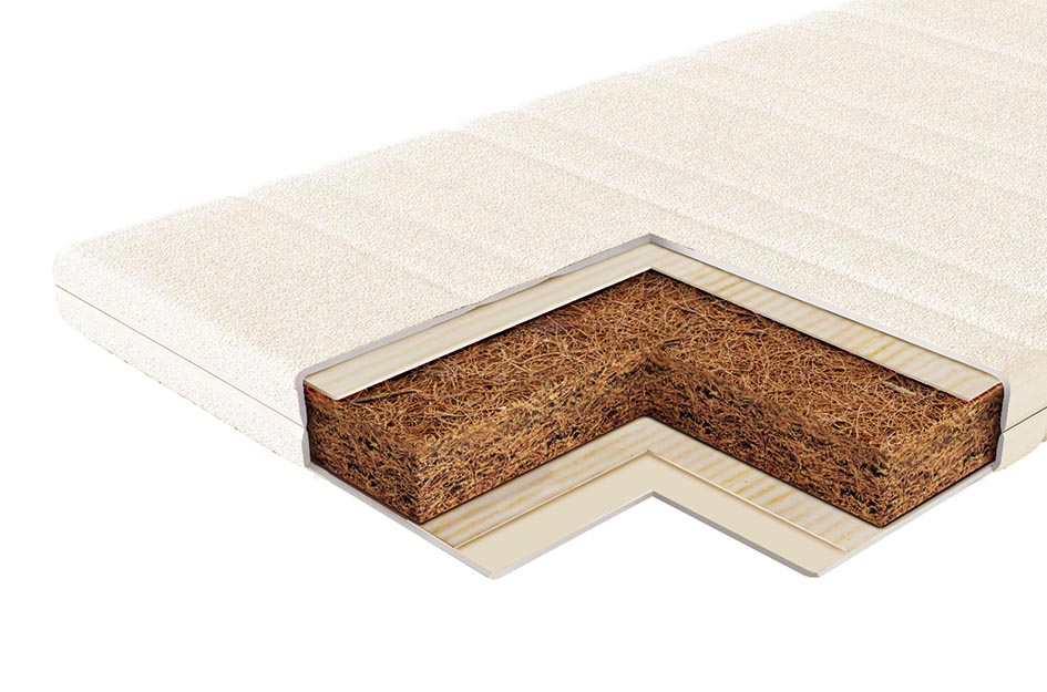 - Кокосовая койра. Натуральный материал, состоящий из спрессованных волокон кокосового ореха. Слои из прочной и долговечной кокосовой койры используются для придания матрасу дополнительной жесткости.