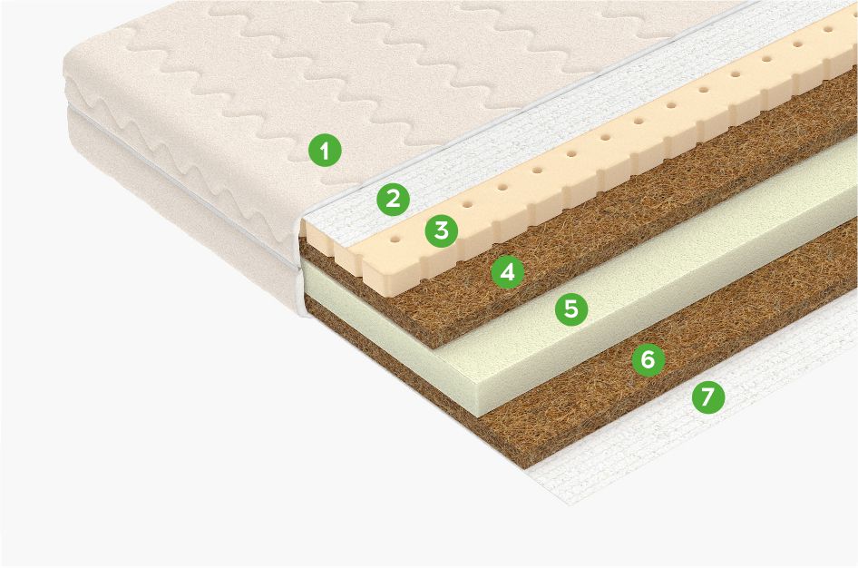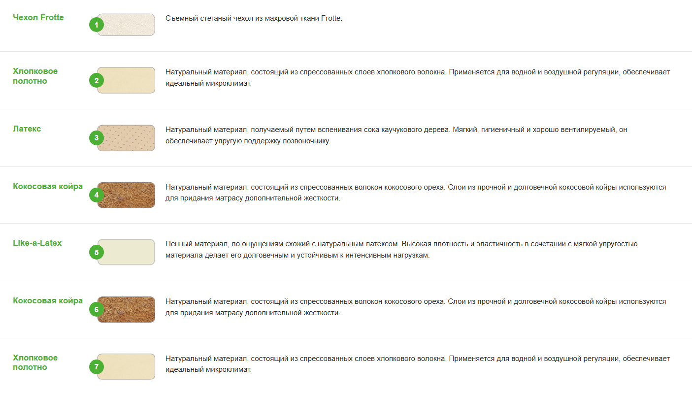 - Кокосовая койра. Натуральный материал, состоящий из спрессованных волокон кокосового ореха. Слои из прочной и долговечной кокосовой койры используются для придания матрасу дополнительной жесткости.