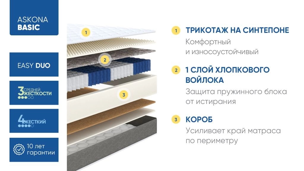 Матрасы Askona Basic – это коллекция базовых матрасов по доступным ценам для молодых активных семей, которые купили и обустраивают новую квартиру, делают ремонт, переезжают в другой город или район, либо подбирают надежный и недорогой матрас для здорового сна своего ребёнка.
