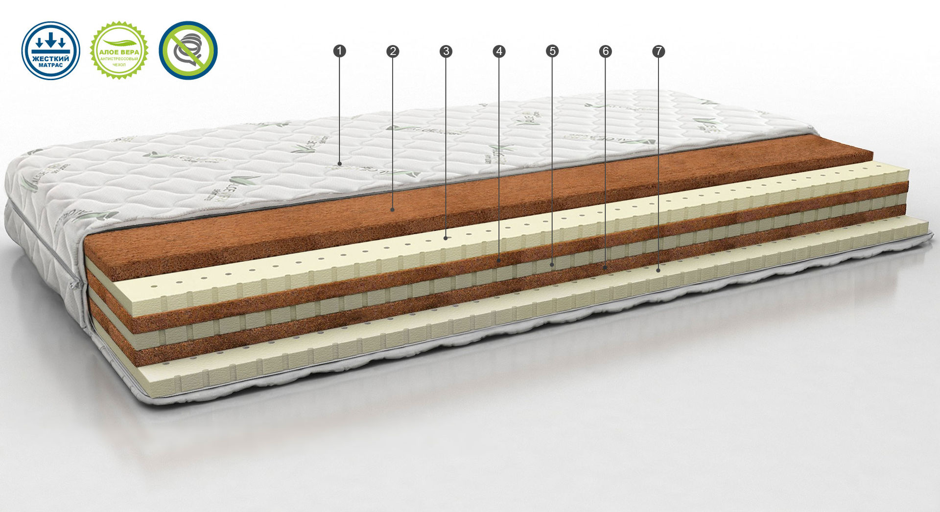 Жесткий матрас с двумя слоями кокосового волокна и блоком независимых пружин.