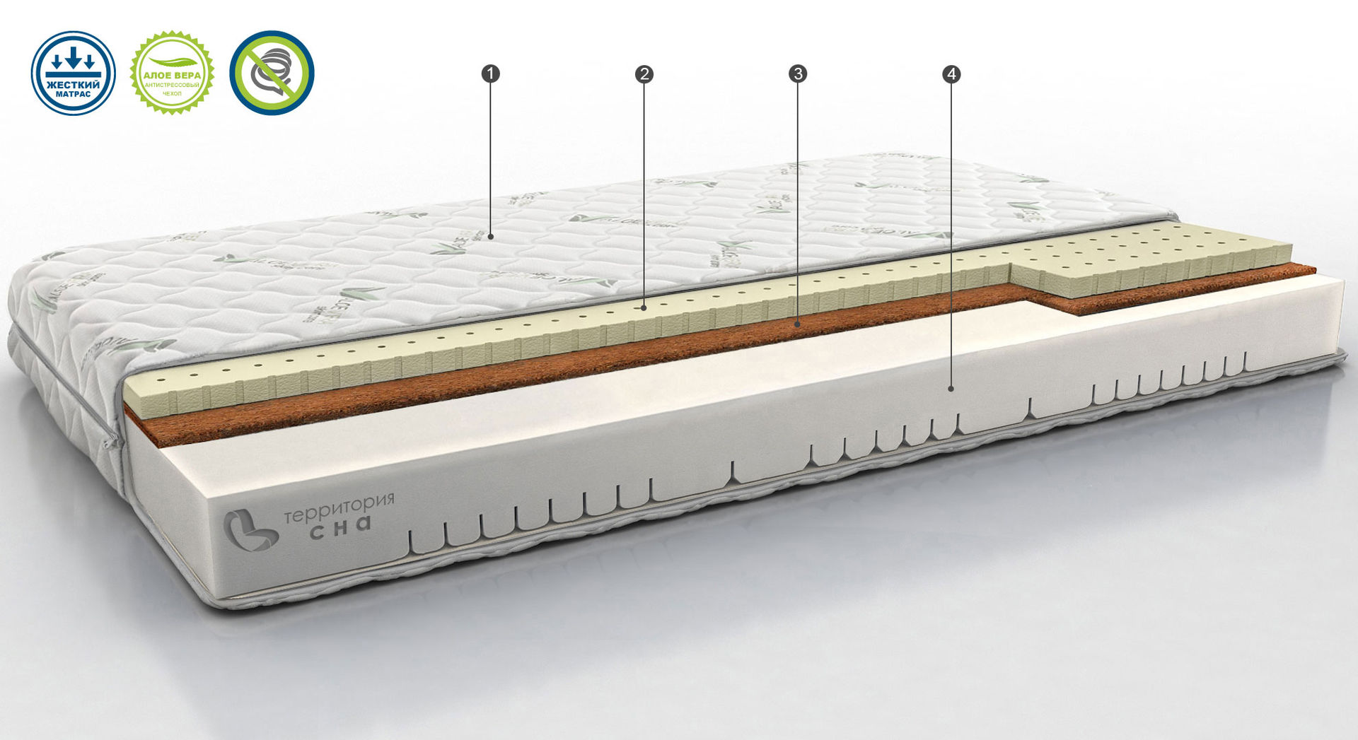 Жесткий матрас с блоком независимых пружин и кокосовым волокном.