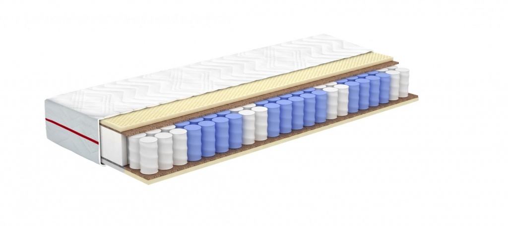 Наполнение матраса: латекс 20 мм/кокосовая койра 10 мм/ блок независимых пружин 150 мм/кокосовая койра 10 мм/латекс 20 мм.