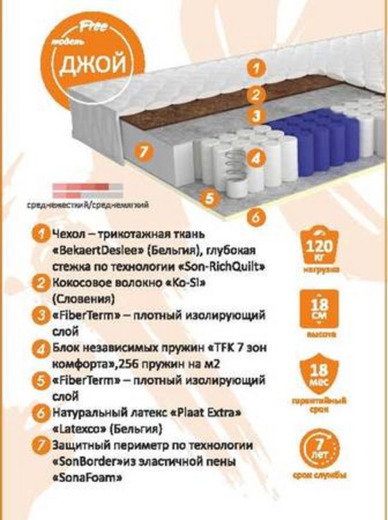 Высота матраса: 18 см. Жесткость: средняя.