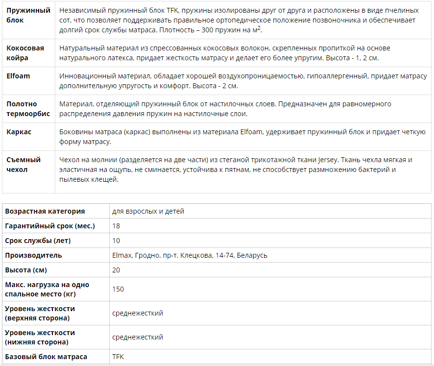 Высота матраса: 20 см. Жесткость: выше средней.