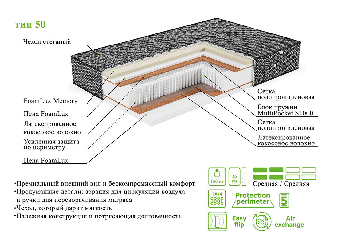 Матрас выполнен на основе пружинного блока премиум класса с настилочными слоями увеличенной высоты. Это делает модель выше (высота — 29 сантиметров!) и надежнее (нагрузка на спальное место до 150кг). Аэраторы по периметру матраса создают циркуляцию воздуха внутри и увеличивают его срок службы. Пружинный блок и пена с эффектом памяти моментально подстраиваются под положение тела, а дополнительный эффект невесомости создаёт пышная стежка чехла.
