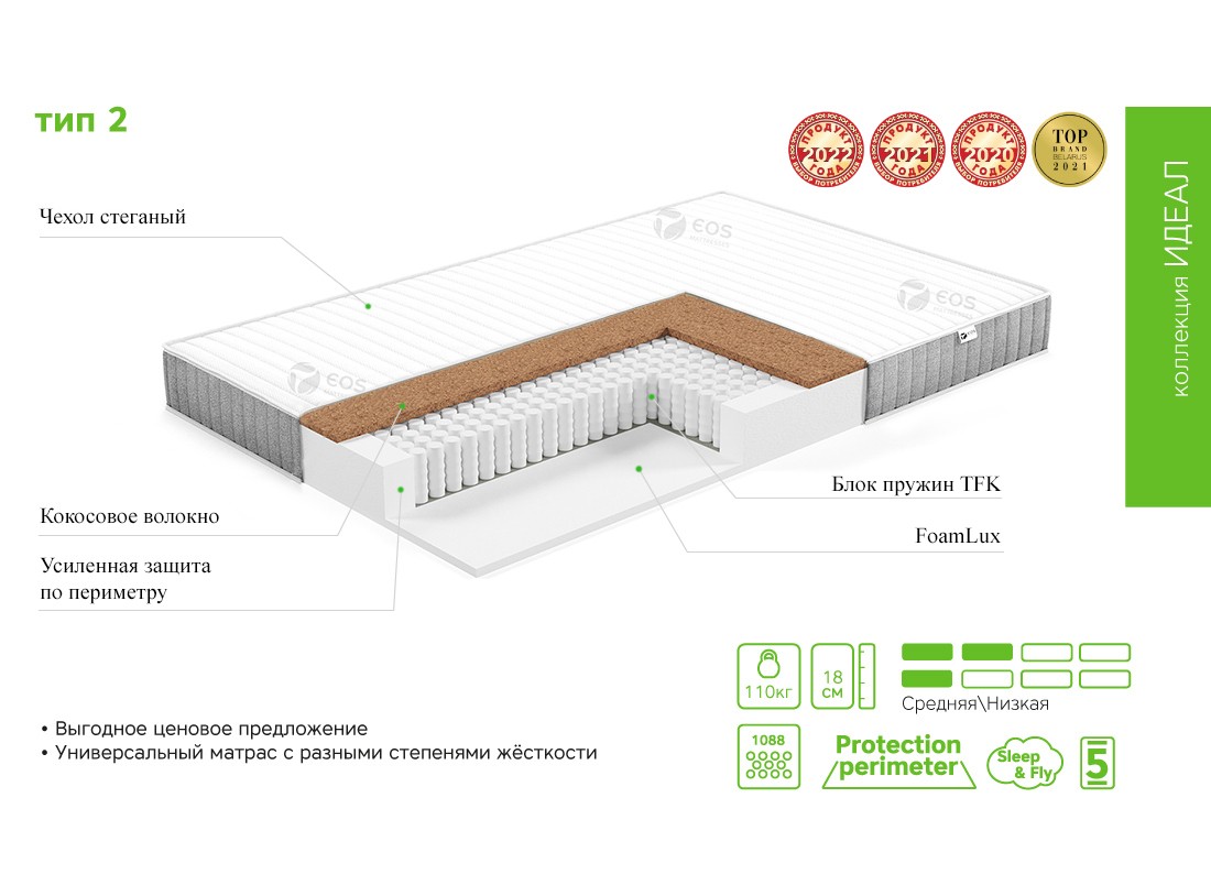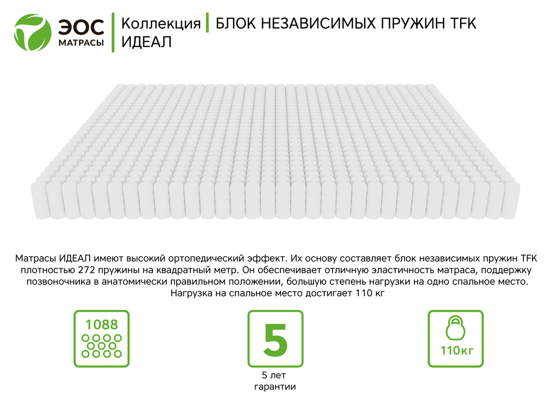 Созданные из экологически чистых и натуральных материалов матрасы коллекции «Идеал» обладают высокими прочностными характеристиками. Их основу составляет блок независимых пружин TFK в котором каждая пружина блока находится в отдельном тканевом чехле, что обеспечивает отличную эластичность матраса и поддержку позвоночника в анатомически правильном положении. Матрас EOS Идеал 2 –это универсальный матрас с разными степенями жесткости.