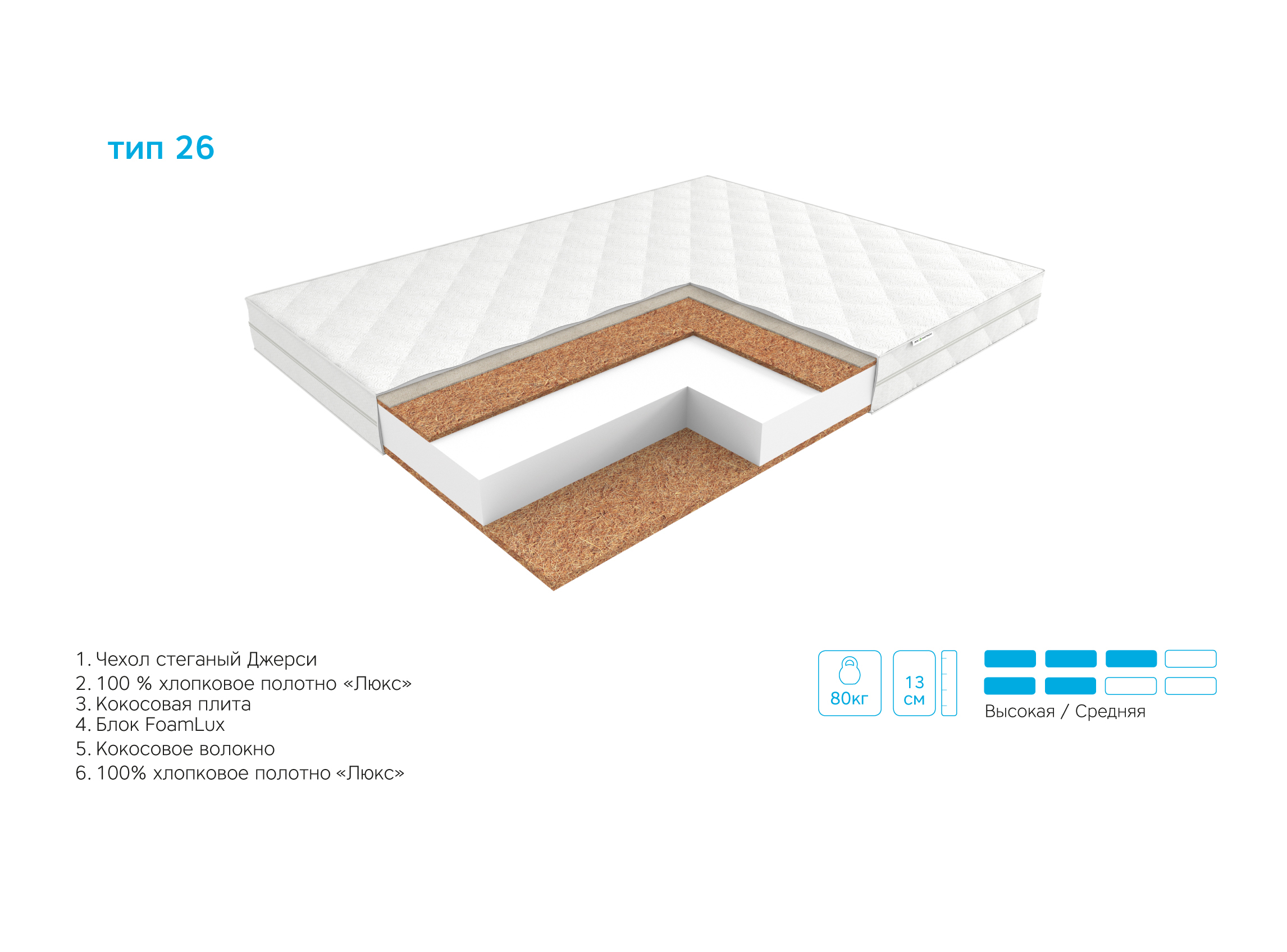 Высота матраса: 21 см. Жесткость: средне-жесткий / средне-мягкий.