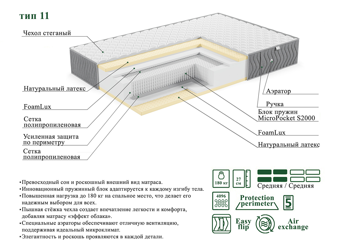 Матрас EOS Люкс «Тип 11» — это изысканный дизайн для истинных ценителей красоты. Плотный жаккард обеспечивает долговечность внешнего вида, а ручки по боковым граням матраса позволяют легко переворачивать его для увеличения срока службы.
