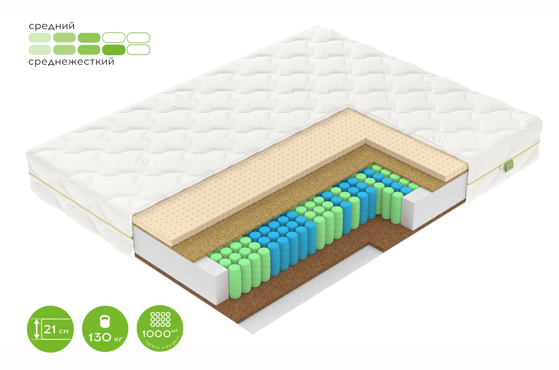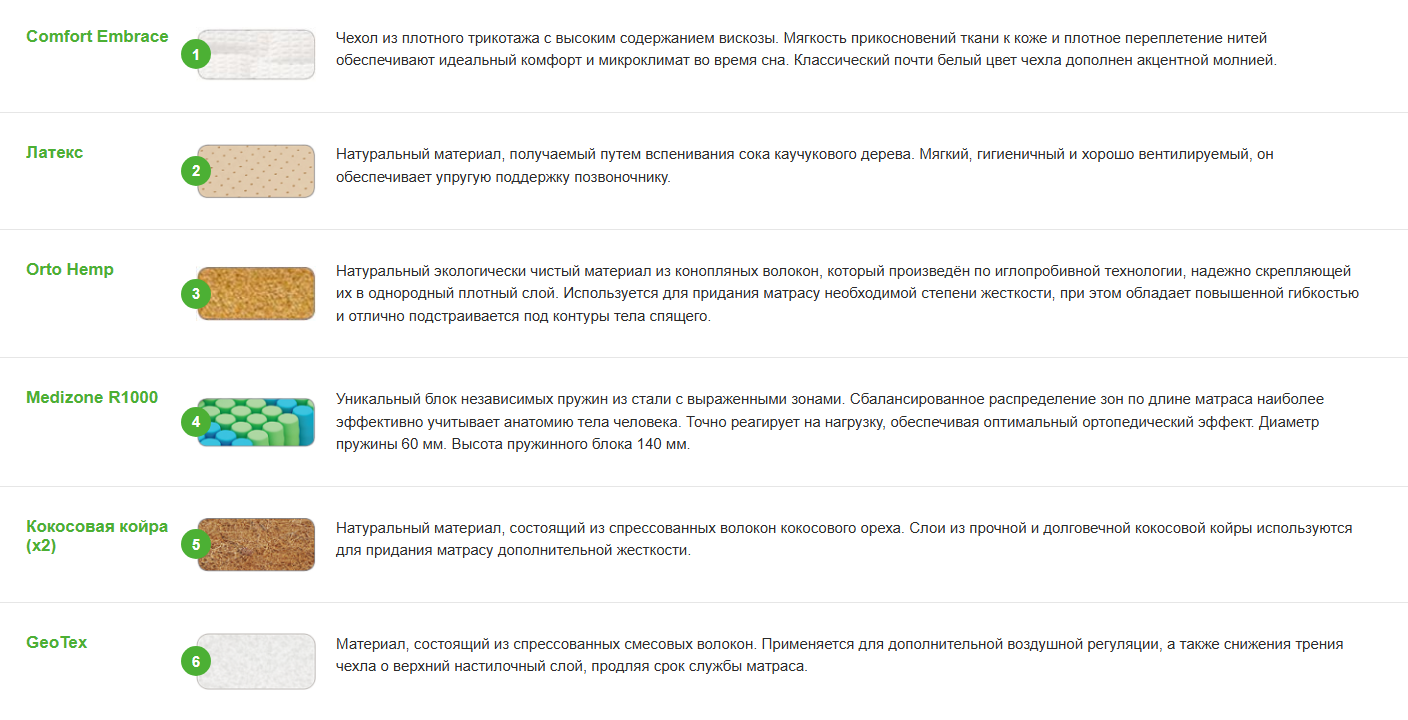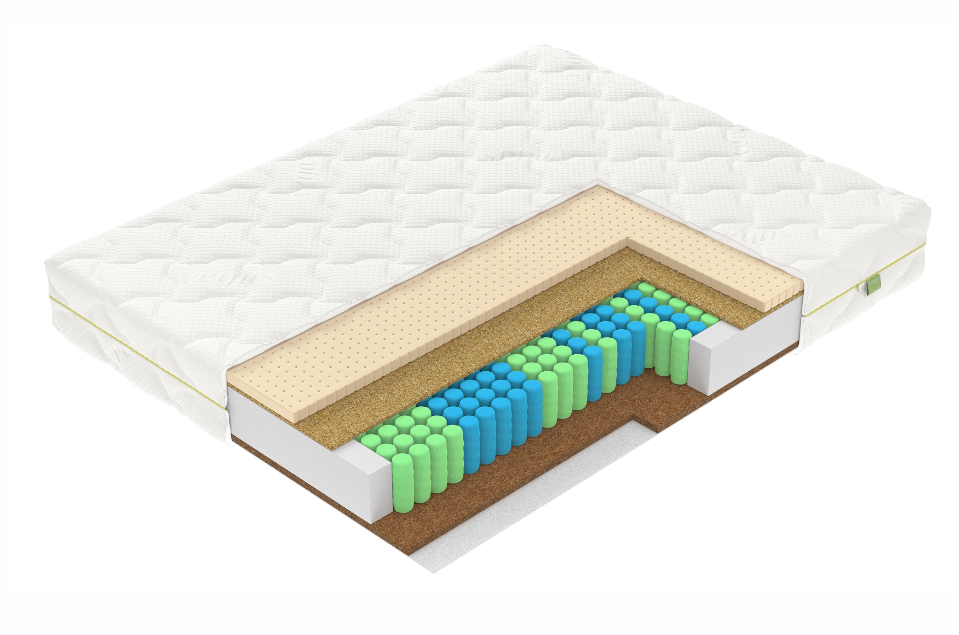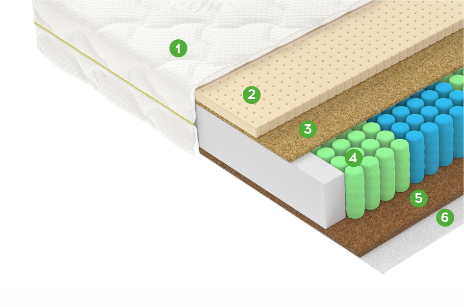 - Кокосовая койра (x2). Натуральный материал, состоящий из спрессованных волокон кокосового ореха. Слои из прочной и долговечной кокосовой койры используются для придания матрасу дополнительной жесткости.