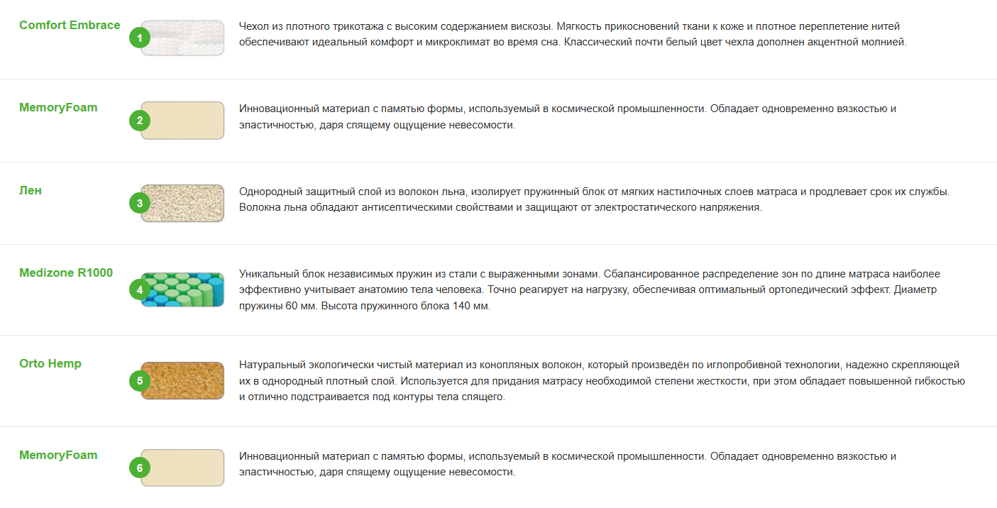 - MemoryFoam. Инновационный материал с памятью формы, используемый в космической промышленности. Обладает одновременно вязкостью и эластичностью, даря спящему ощущение невесомости.