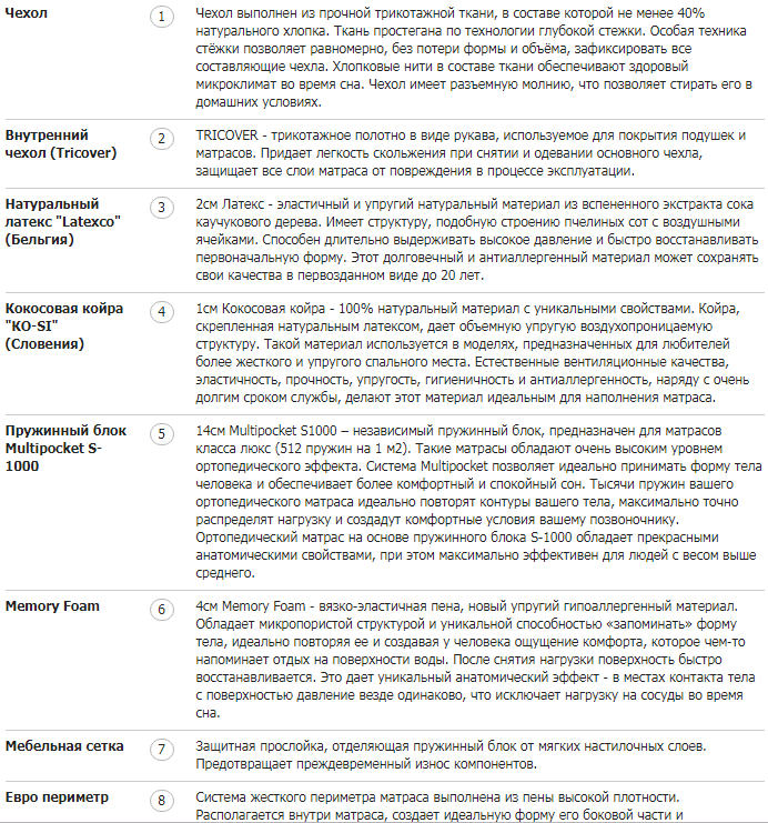В основе модели два независимых блока пружин, которые в сочетании с толстым слоем натурального латекса позволяют получить усиленную поддержку и анатомически правильное положение тела во время сна.
