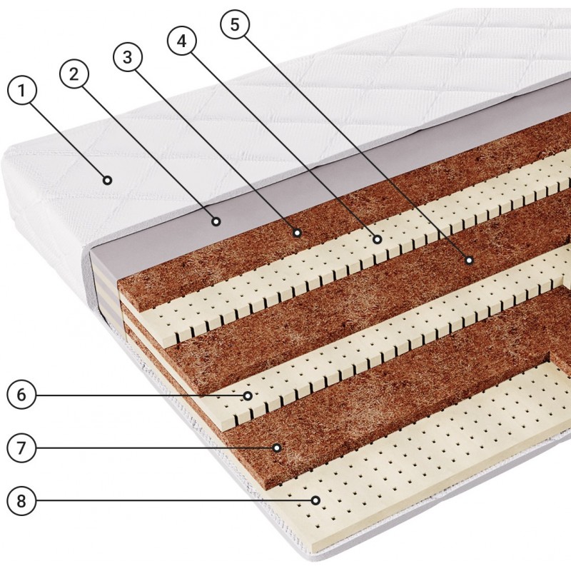 Наполнение: 2 латексные плиты, 2 слоя кокосового волокна, независимый пружинный блок.