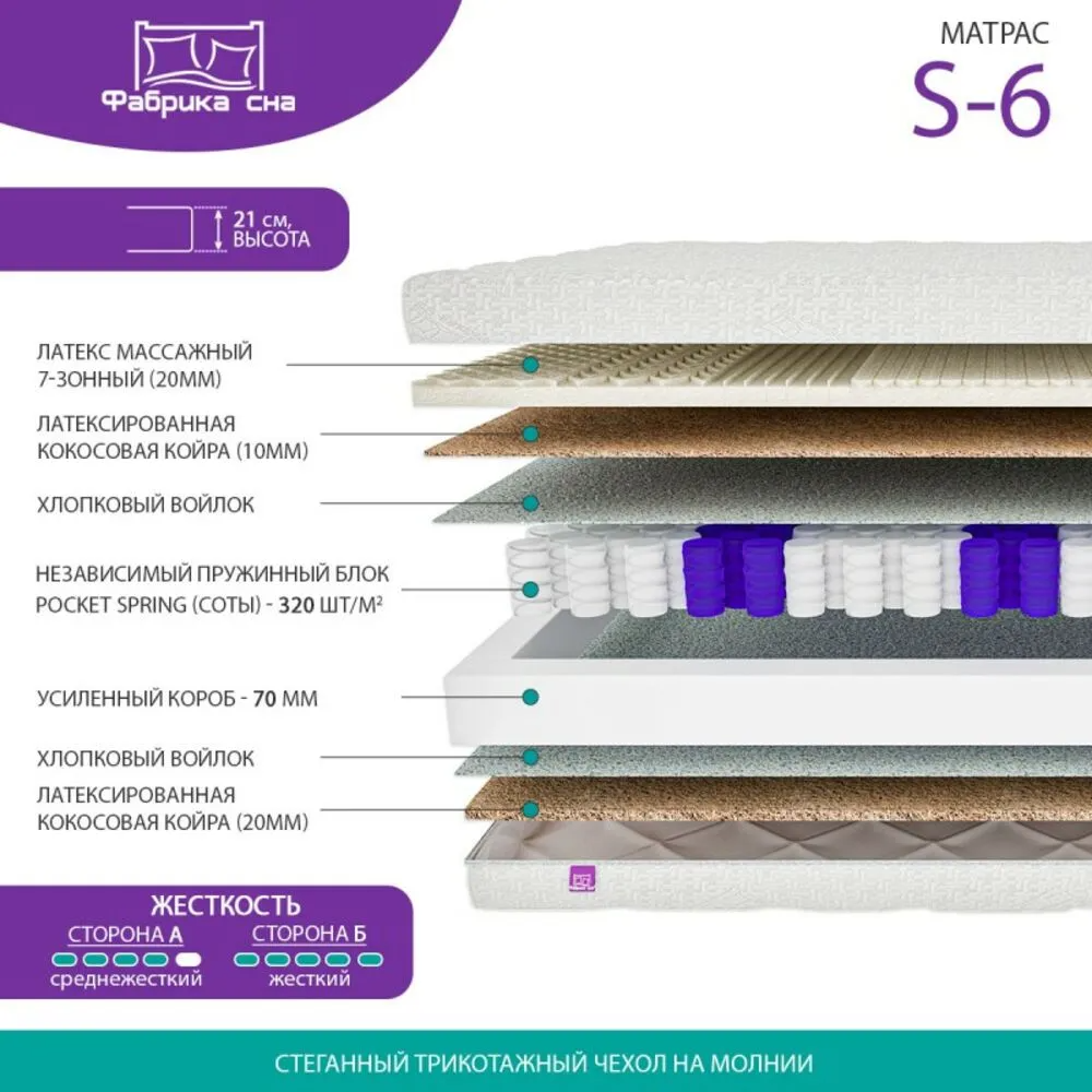 Высота матраса: 21 см. Жесткость: средне-жесткий / средне-мягкий.