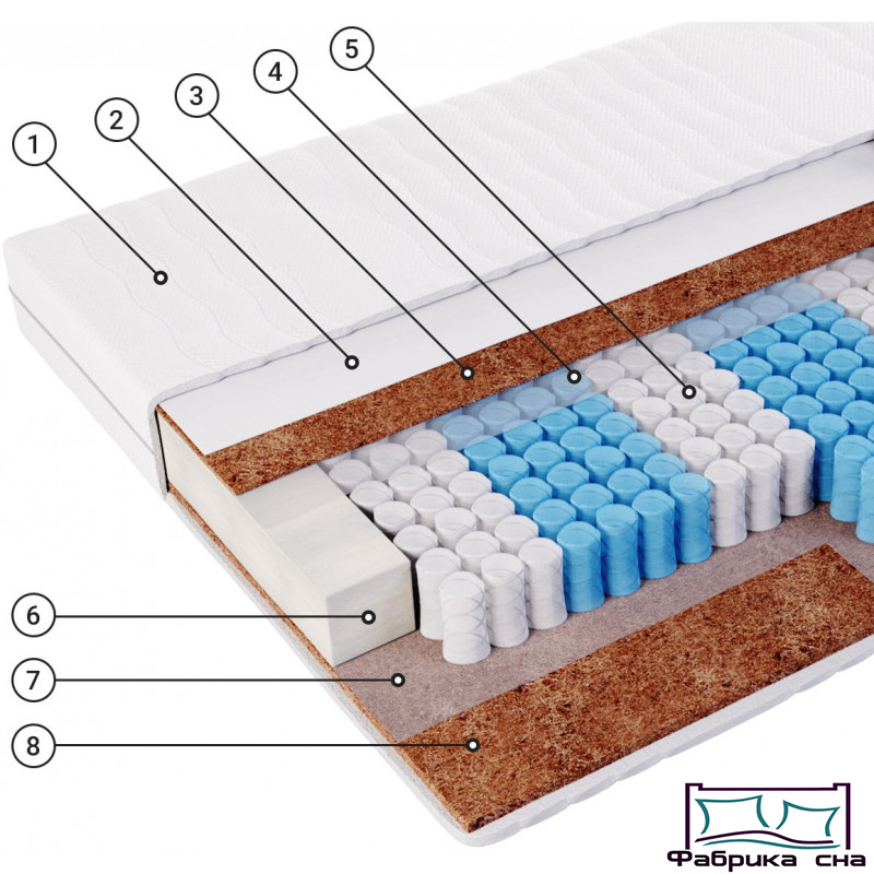 Жесткий матрас с двумя слоями кокосового волокна и блоком независимых пружин.