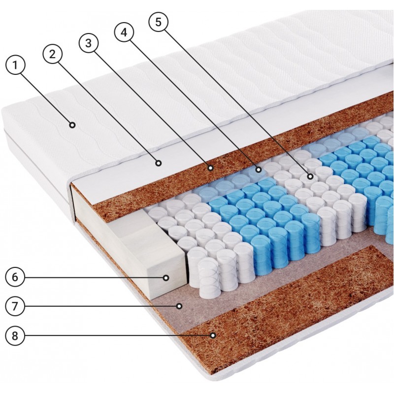 2см Кокосовая койра - 100% натуральный материал с уникальными свойствами. Койра, скрепленная натуральным латексом, дает объемную упругую воздухопроницаемую структуру. Такой материал используется в моделях, предназначенных для любителей более жесткого и упругого спального места. Естественные вентиляционные качества, эластичность, прочность, упругость, гигиеничность и антиаллергенность, наряду с очень долгим сроком службы, делают этот материал идеальным для наполнения матраса.