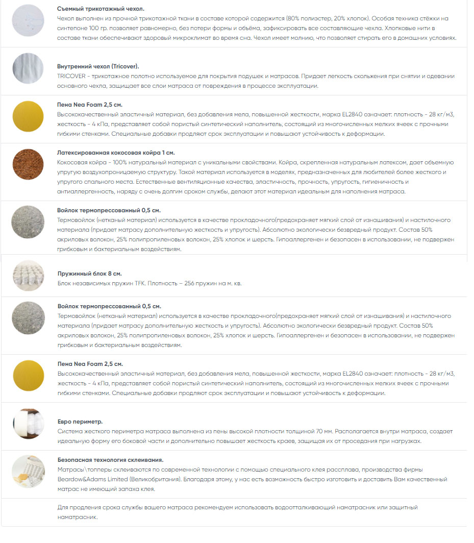 Слои матраса: nea foam / кокосовая койра / nea foam