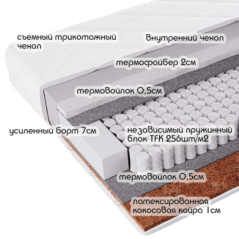 Средне-жесткий матрас с настилом из кокосового волокна и термофайбера.