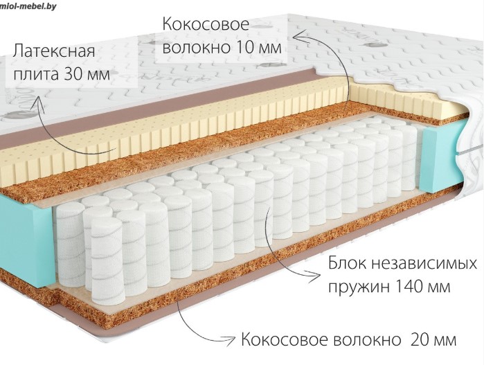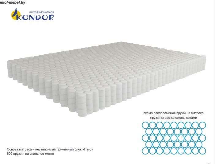 Основа матраса: блок независимых пружин Hard, высота 140 мм Количество пружин на спальное место: 600 шт. Настил матраса (верхняя сторона): кокосовое волокно 10 мм, латексная плита 30 мм Настил матраса (нижняя сторона): кокосовое волокно 20 мм Ткань матрасного чехла: трикотажная, жаккардовая Срок гарантии: 36 месяцев Срок службы: 10 лет