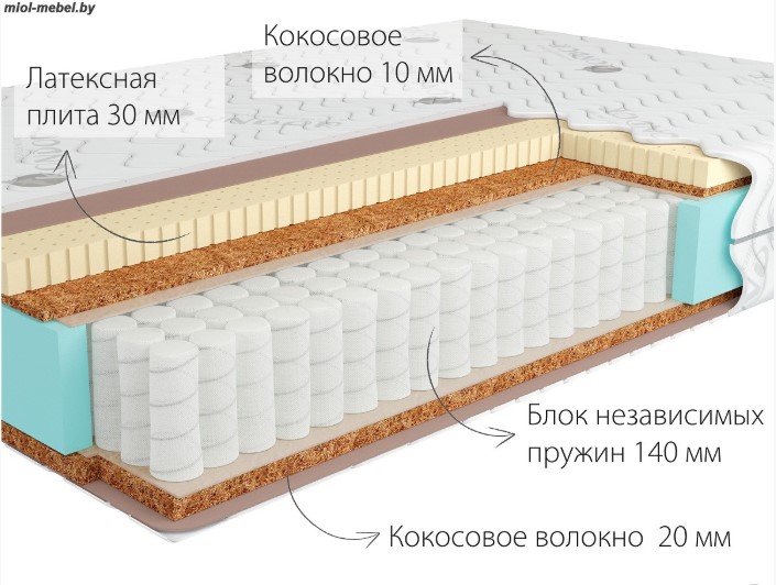 Основа матраса: блок независимых пружин Medio, высота 140 мм Количество пружин на спальное место: 520 шт. Настил матраса (верхняя сторона): кокосовое волокно 10 мм, латексная плита 30 мм Настил матраса (нижняя сторона): кокосовое волокно 20 мм Ткань матрасного чехла: трикотажная, жаккардовая Срок гарантии: 36 месяцев Срок службы: 10 лет