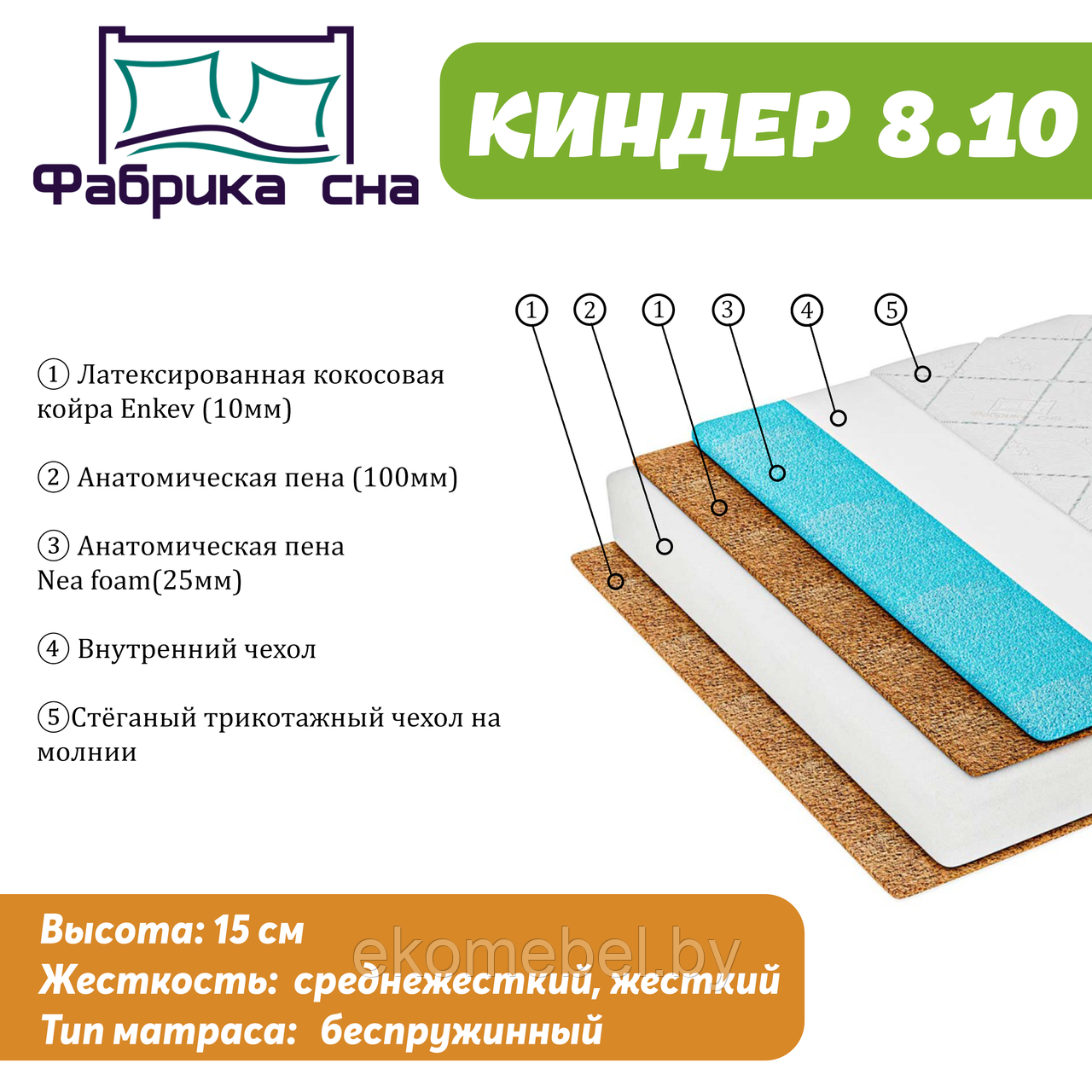 Беспружинный матрас "Киндер 8.10" высотой 15 см состоит из следующих материалов: