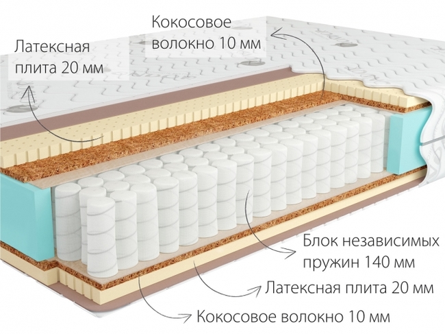 Наполнение: блок независимых пружин 140 мм, кокосовая койра и латекс. Высота: 21 см.