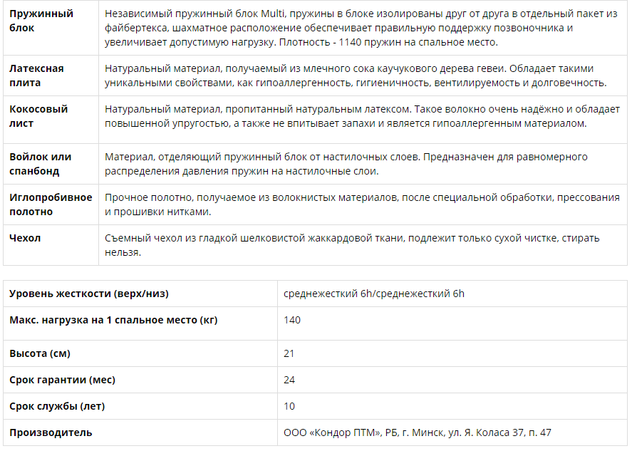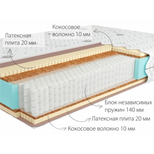 Независимый пружинный блок с двумя зонами разной жесткости. Высота матраса: 18 см.