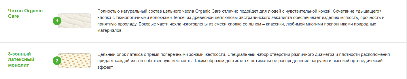 - 3-зонный латексный монолит. Цельный блок латекса с тремя поперечными зонами жесткости. Специальный набор отверстий различного диаметра и плотности расположения придает каждой из зон собственную жесткость. Таким образом достигается оптимальное распределение нагрузки и высокий ортопедический эффект.